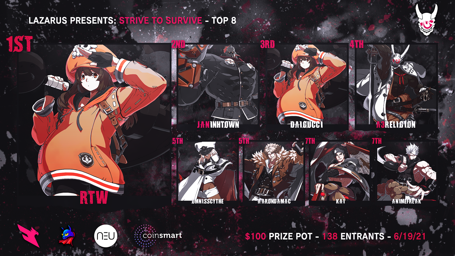Strive to Survive was the inaugural tournament for the fighting game "Guilty Gear Strive," hosted by Lazarus Esports. This project encompasses the brand direction developed for the event, marrying both the Lazarus and Guilty Gear identities; as well as showcasing the social media and livestream broadcast assets designed